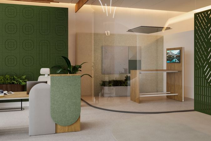Thekenfront und Arbeitsplatte: Spanplatte Klasse 1 - beidseitig mit Melaminharz von erhöhter Beständigkeit beschichtet. Spanplatten erfüllen die Emissionsklasse E1. Arbeitsplatte mit ABS-Kante. Stabilität der Empfangstheke wird durch durch ein Metallgestell gesichert. Thekenfront mit vertikaler Maserung. Stoffbezogenes Paneel mit Plattenkonstruktion. |