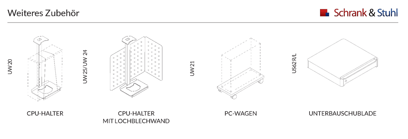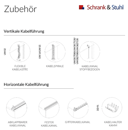 Verschiedene Horizontale Kabelkanäle, vertikale Kabelführungen und weiteres Zubehör auswählbar - siehe oben Farbe der Arbeitsplattenkante wie Arbeitsplatte |