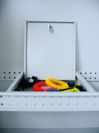 robuster, komplett verschweißter Stahlkorpus mit Vollblechtüren oder Lochfeldtüren (Quadratlochung 0,5 cm) - Auswahlmöglichkeit siehe oben Halter für Reifen/ Seile verzinkt - alle anderen Ausstattungselemente sind pulverbeschichtet |